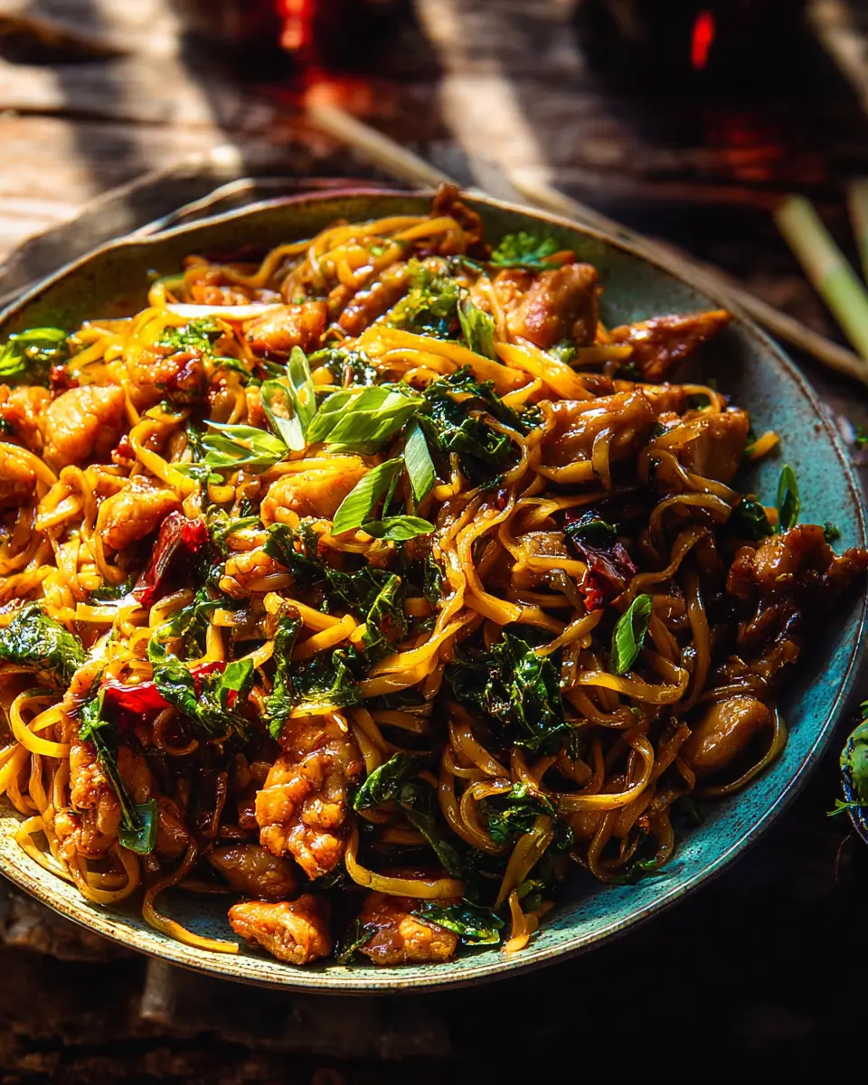 Now comes the fun part—combining everything! Return the chicken to the skillet with the sautéed vegetables, and pour in the prepared sauce along with the drained noodles. Toss everything together, allowing the sauce to coat every noodle and piece of chicken. Cook for another 3-5 minutes, ensuring that everything is heated through. Before serving, stir in half a cup of chopped Thai or regular basil for freshness.