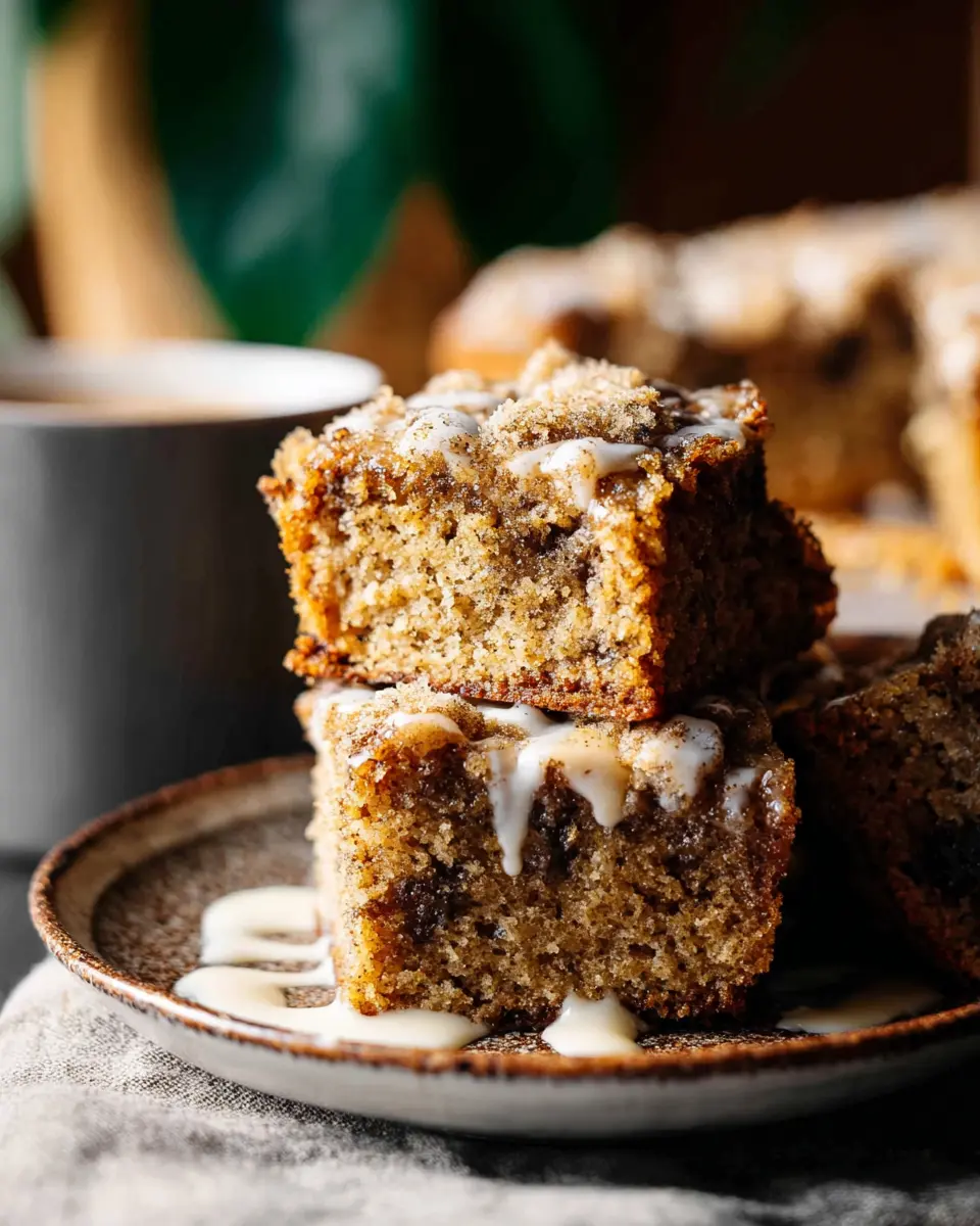 Once your banana coffee cake is out of the oven, let it cool for 30–40 minutes. While the cake cools, whisk together ½ cup of powdered sugar and 1 tablespoon of milk until you reach a smooth consistency. Drizzle this icing over your cake for that extra sweet touch.