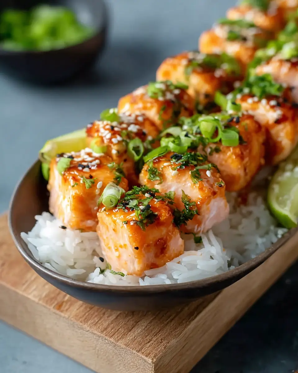 - Layered bowls: Start with a scoop of jasmine rice, followed by the salmon cubes arranged artistically on top. Add the cucumber and avocado salad on the side for colorful contrast.