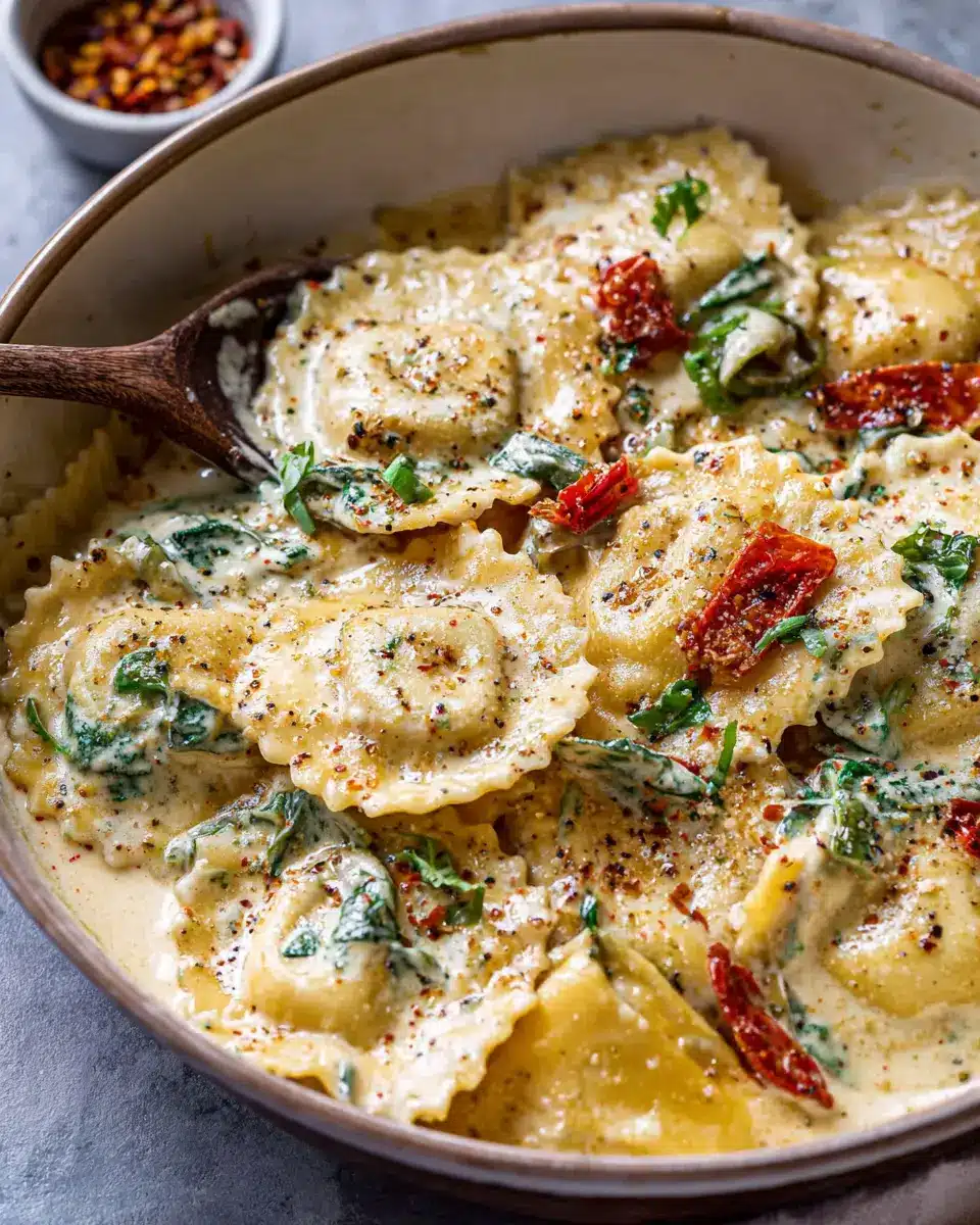 So there you have it—your creamy Tuscan ravioli is ready to be devoured! Enjoy this delightful dish with a side of garlic bread for the full experience. What are your favorite side dishes to accompany pasta? Feel free to share your tips in the comments! Happy cooking!