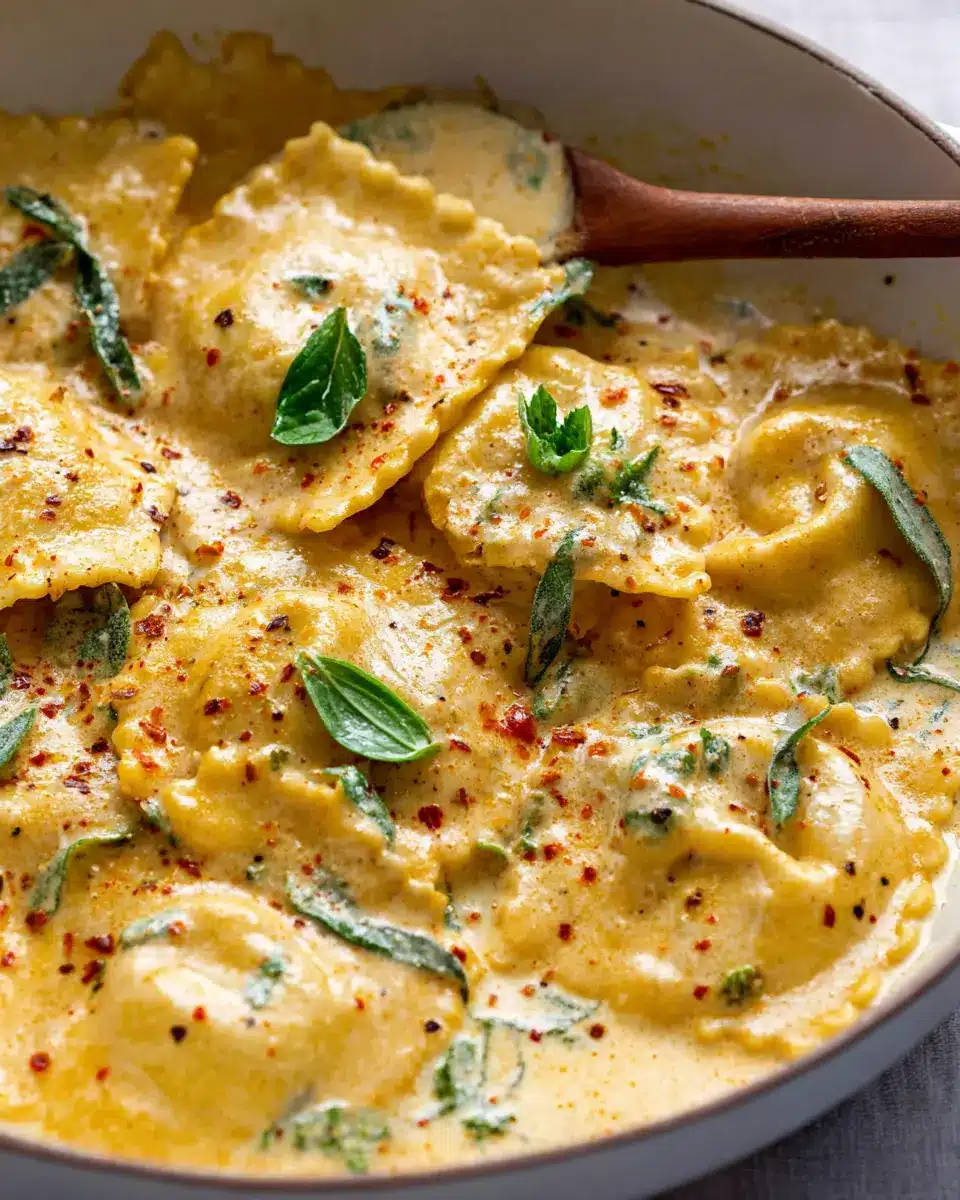 - Finally, add the cooked ravioli to the sauce, stirring gently to coat each piece in that luscious mixture.