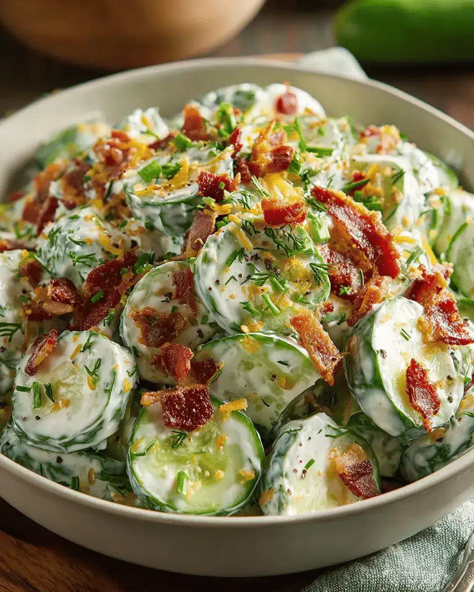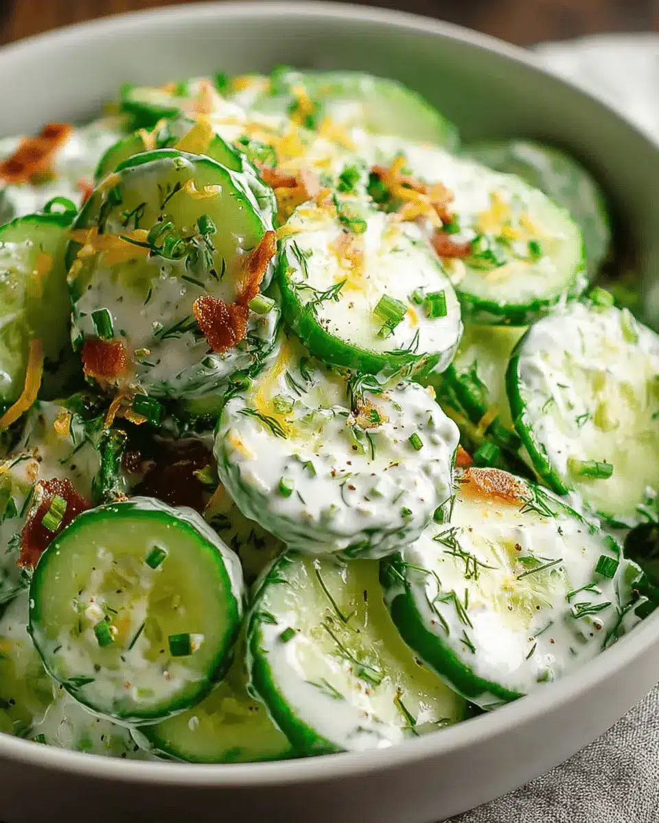 - In a large mixing bowl, toss together the sliced cucumbers, shredded cheddar cheese, crumbled bacon, and chopped green onions. Give everything a gentle mix so it's evenly distributed.