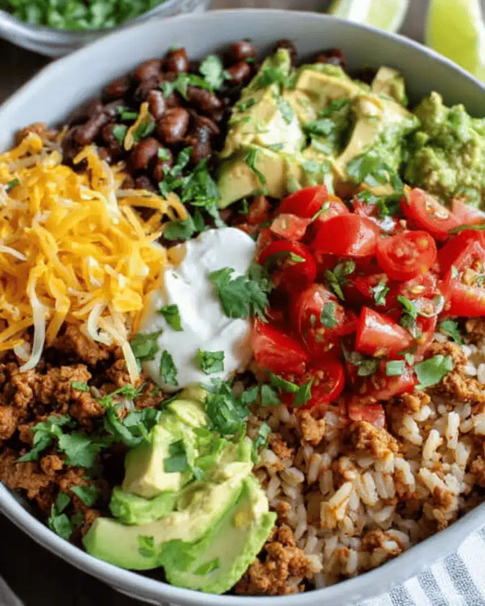 If you’re looking to switch things up, consider making a vegetarian taco rice bowl. Swap the ground turkey for your favorite plant-based protein, such as lentils or crumbled tempeh, seasoned with taco spices for that same delicious flavor. You can also add more vegetables like bell peppers and corn to create a colorful, nutrient-dense meal. Don’t forget to incorporate black beans for protein and fiber!