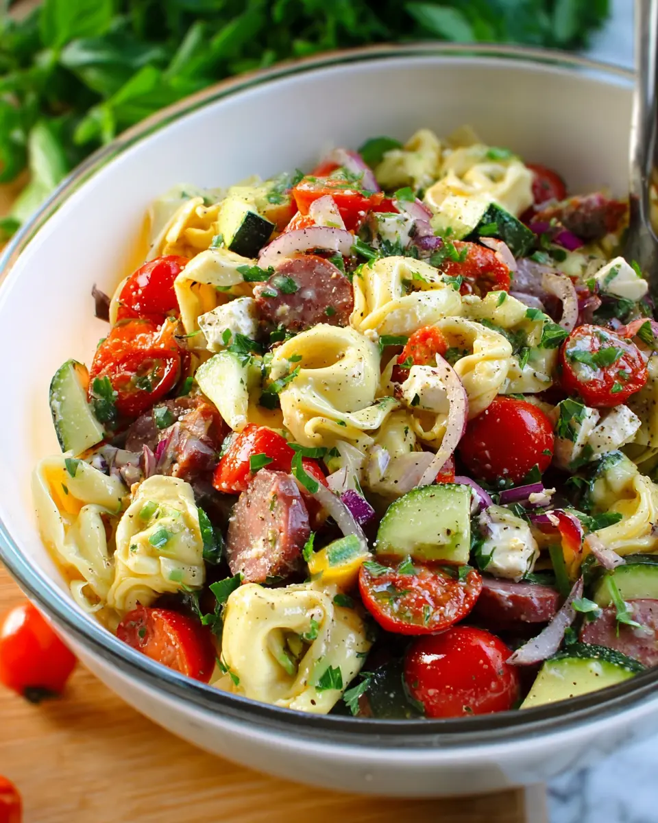 Feel free to customize the salad to fit your taste or dietary preferences. Instead of cheese tortellini, you could use whole grain or gluten-free pasta. For proteins, diced grilled chicken, turkey bacon, or even chickpeas can be great alternatives to salami. If you’re not a fan of olives, consider adding artichoke hearts or sun-dried tomatoes for a flavorful twist.