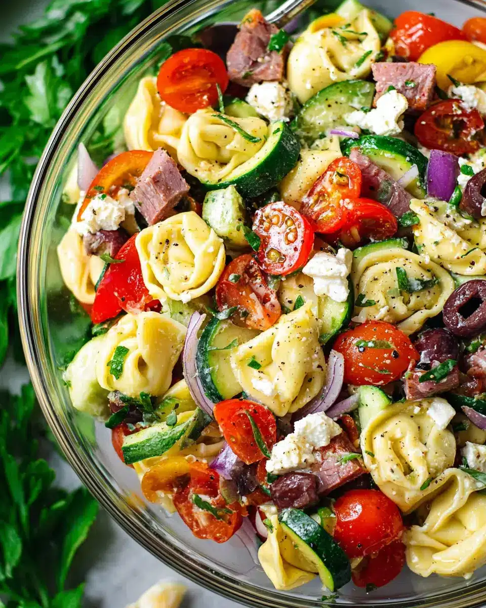 Once everything is prepared, it’s time to bring all the elements together! Add the cooled tortellini to the bowl with the vegetables, and then pour in your beautifully crafted dressing. Toss gently to combine, ensuring every piece is coated in that mouthwatering dressing.