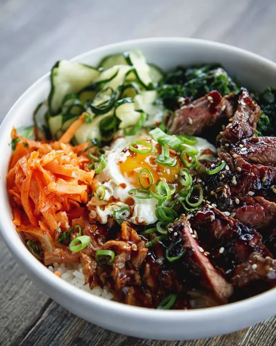 To elevate your Korean BBQ Steak Rice Bowls, consider serving them with a side of crispy Korean-style fried chicken. The crunch and flavor pair beautifully with the tender steak and fresh veggies. Another great option is a sesame noodle salad—its nutty flavors and refreshing crunch will provide an excellent contrast to the hearty rice bowls. For a lighter touch, try some miso soup or a simple seaweed salad.