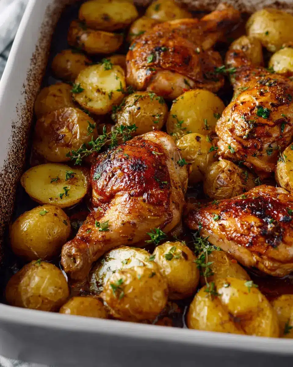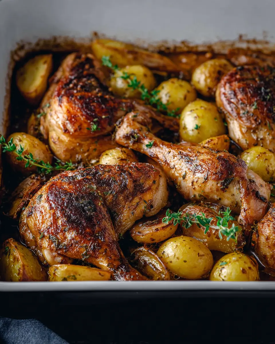 Start by preheating your oven to 400°F. Packing your kitchen with the comforting aroma of roasted chicken is a joy you won’t want to miss. Take your chicken thighs and drumsticks (about 2 ½ pounds), and dry them thoroughly with a paper towel. Not only does this help the skin get crispy, but it also allows the sauce to stick better. Next, grab those baby potatoes (1 ½ pounds) and cut them in half. Their creamy inside paired with the robust chicken flavor creates a delightful medley in each bite.