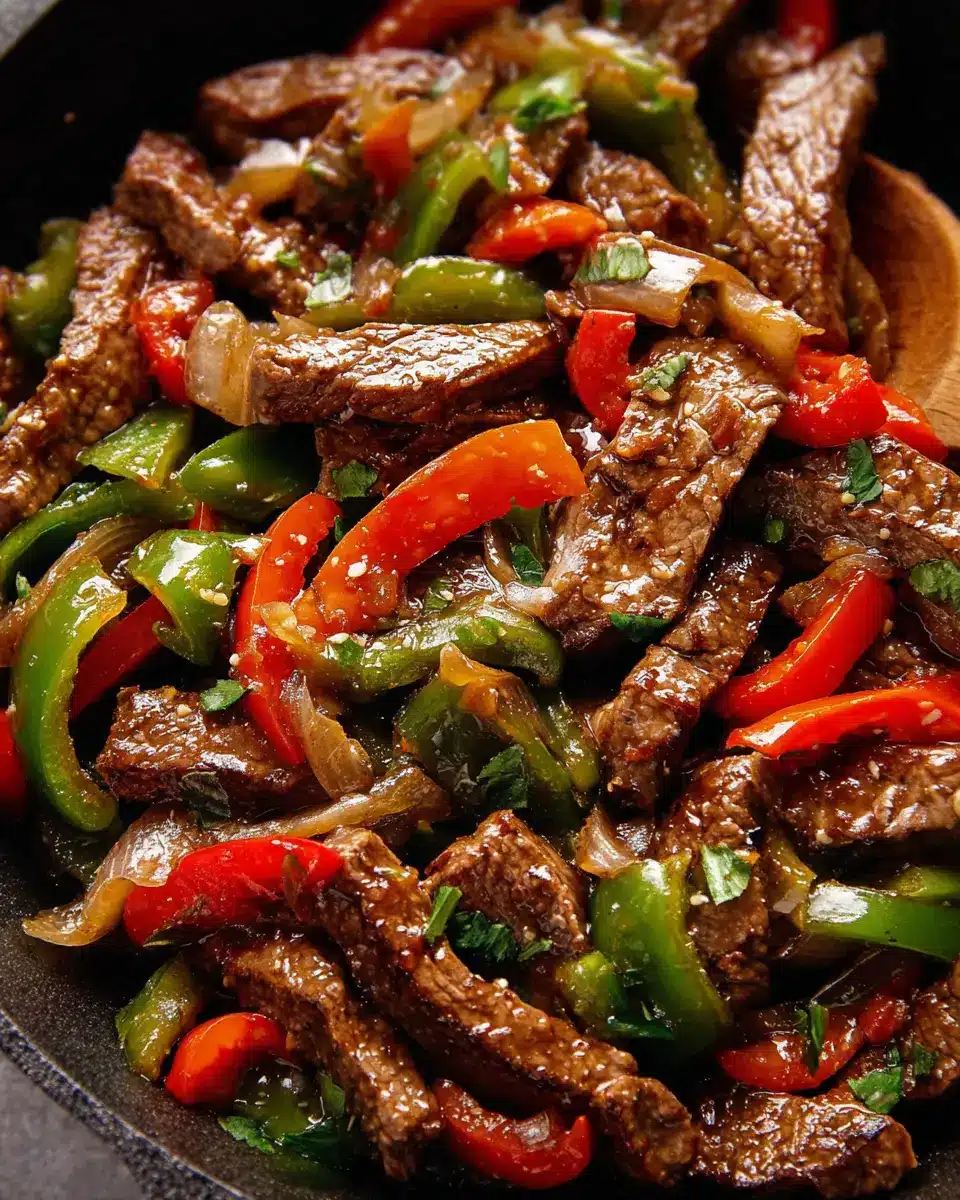 Now’s the time to bring all the flavors together. Return the seared beef to the skillet with the bell pepper mixture. Pour in the sauce you prepared earlier, giving it a good stir. Allow everything to cook together until the sauce becomes glossy and thick, around 2 minutes more. Taste and adjust the seasoning with salt and pepper as desired.