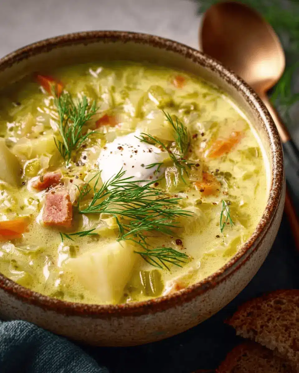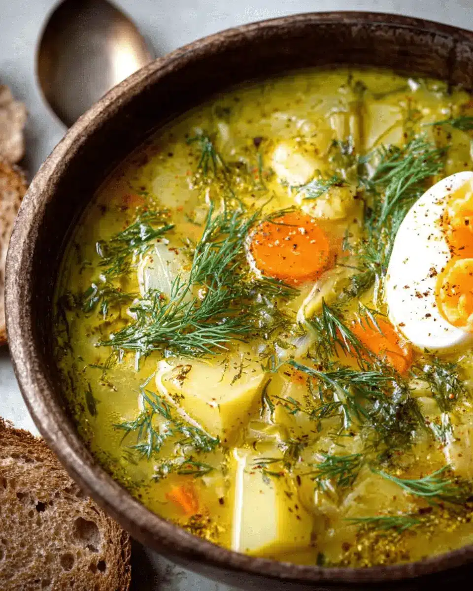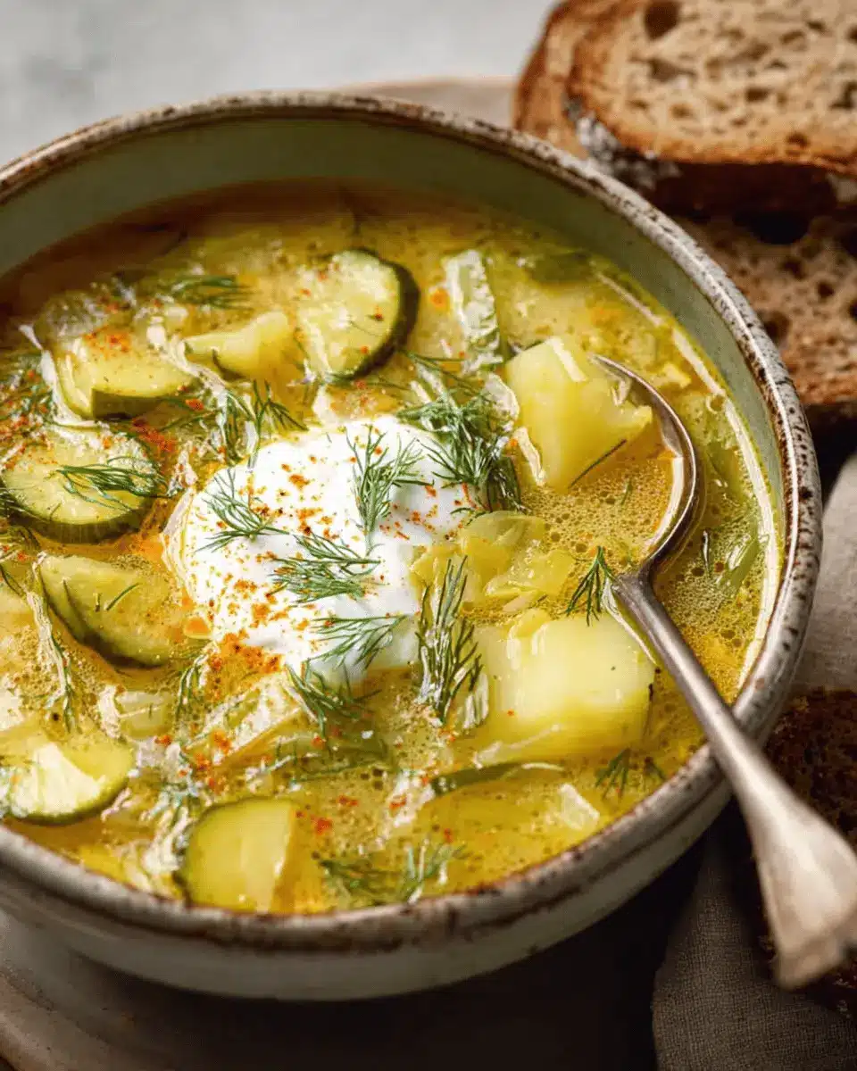 Serve your Polish Dill Pickle Soup warm, topped with a dollop of sour cream and a sprinkle of fresh dill. Pair with rye bread for a comforting meal that warms the heart, and enjoy a taste of tradition in every spoonful!