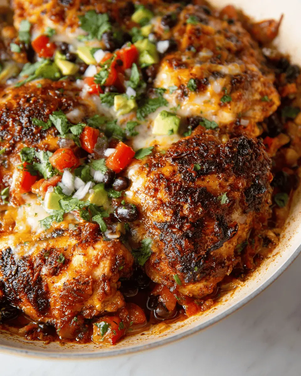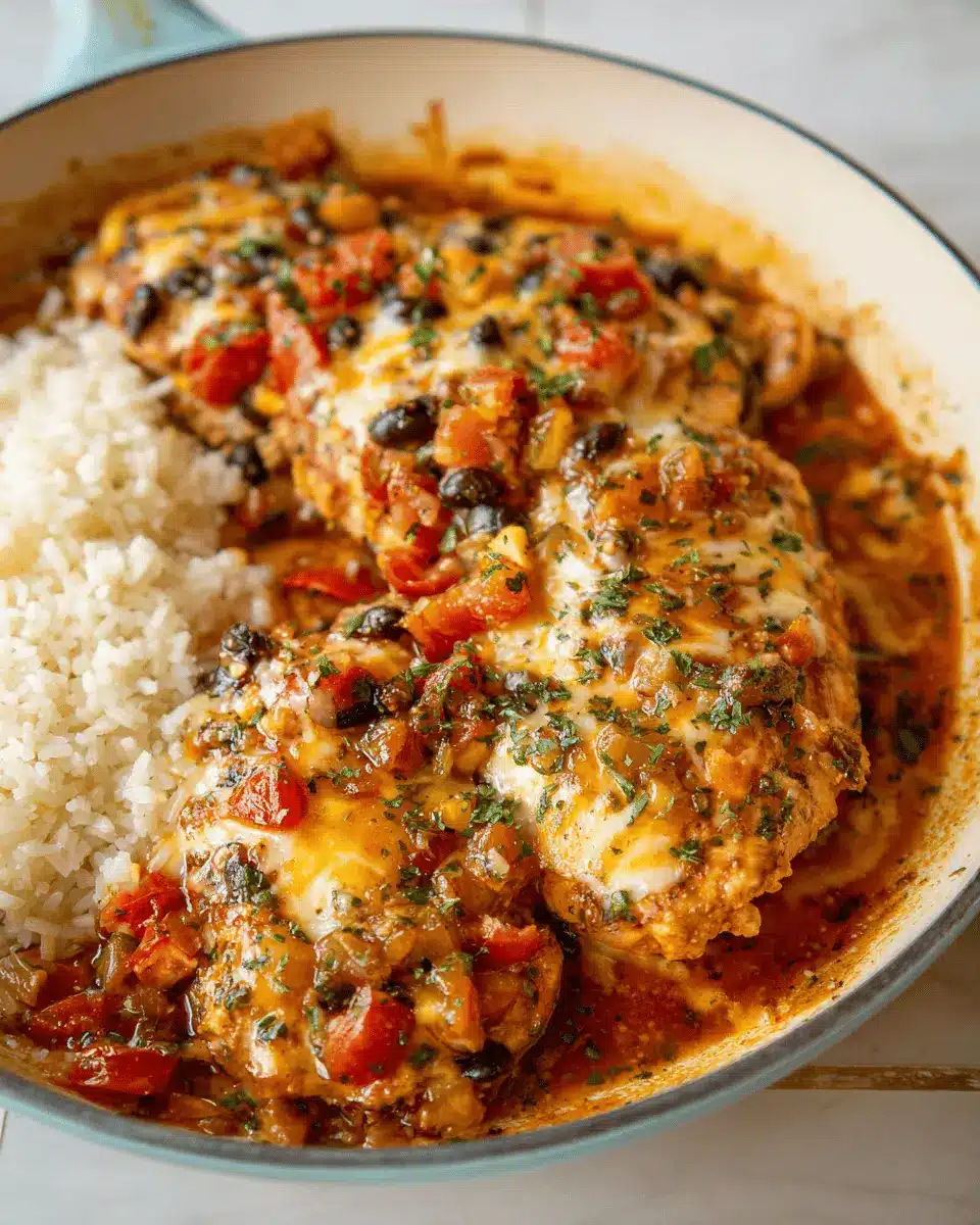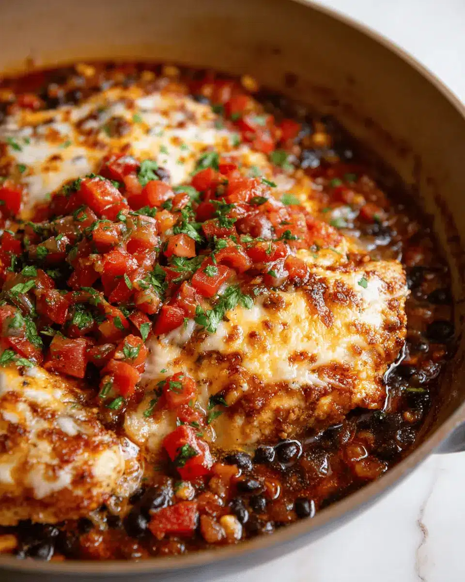 Return the chicken to the skillet, laying them gently on top of the vegetable mixture. Scoop some of that delicious bean medley over each piece, and then generously sprinkle the shredded Mexican cheese mix. Cover the skillet and continue cooking on medium-low heat until the cheese is melted and the chicken reaches an internal temperature of 165°F. Alternatively, for an even meltier finish, you can pop the skillet into a preheated 350°F oven.