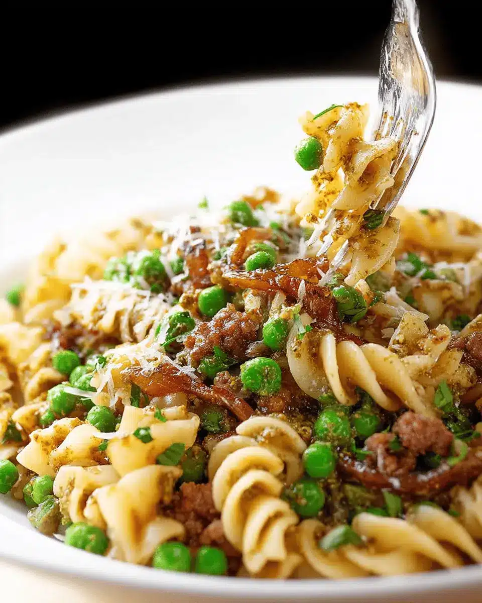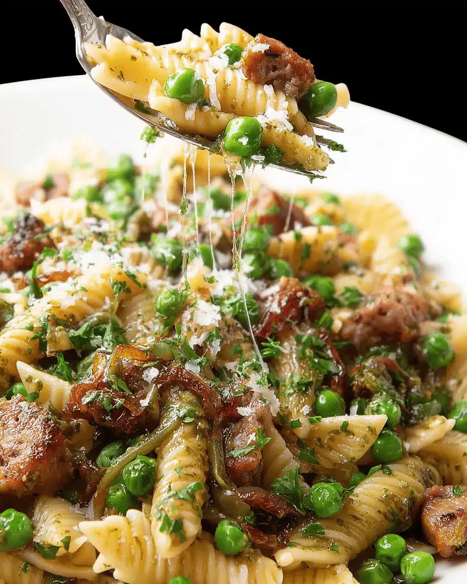 Sausage Pesto Pasta with Caramelized Onions and Peas