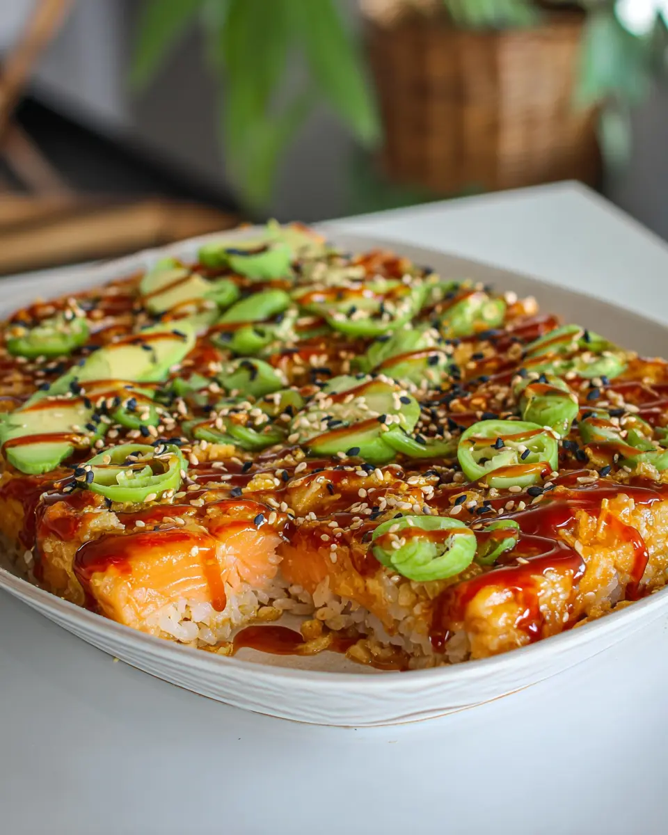 Get creative with presentation! Scoop the spicy salmon sushi bake into individual bowls for a cozy, restaurant-style experience. Alternatively, you can use lettuce leaves to create fresh lettuce wraps, adding an exciting crunch. Garnish with extra toppings like avocado slices and jalapeños for a pop of color. You could also set up a DIY station where guests can add their favorite toppings, making it a fun, interactive meal. These little touches will not only elevate the dish but also impress your friends and family.