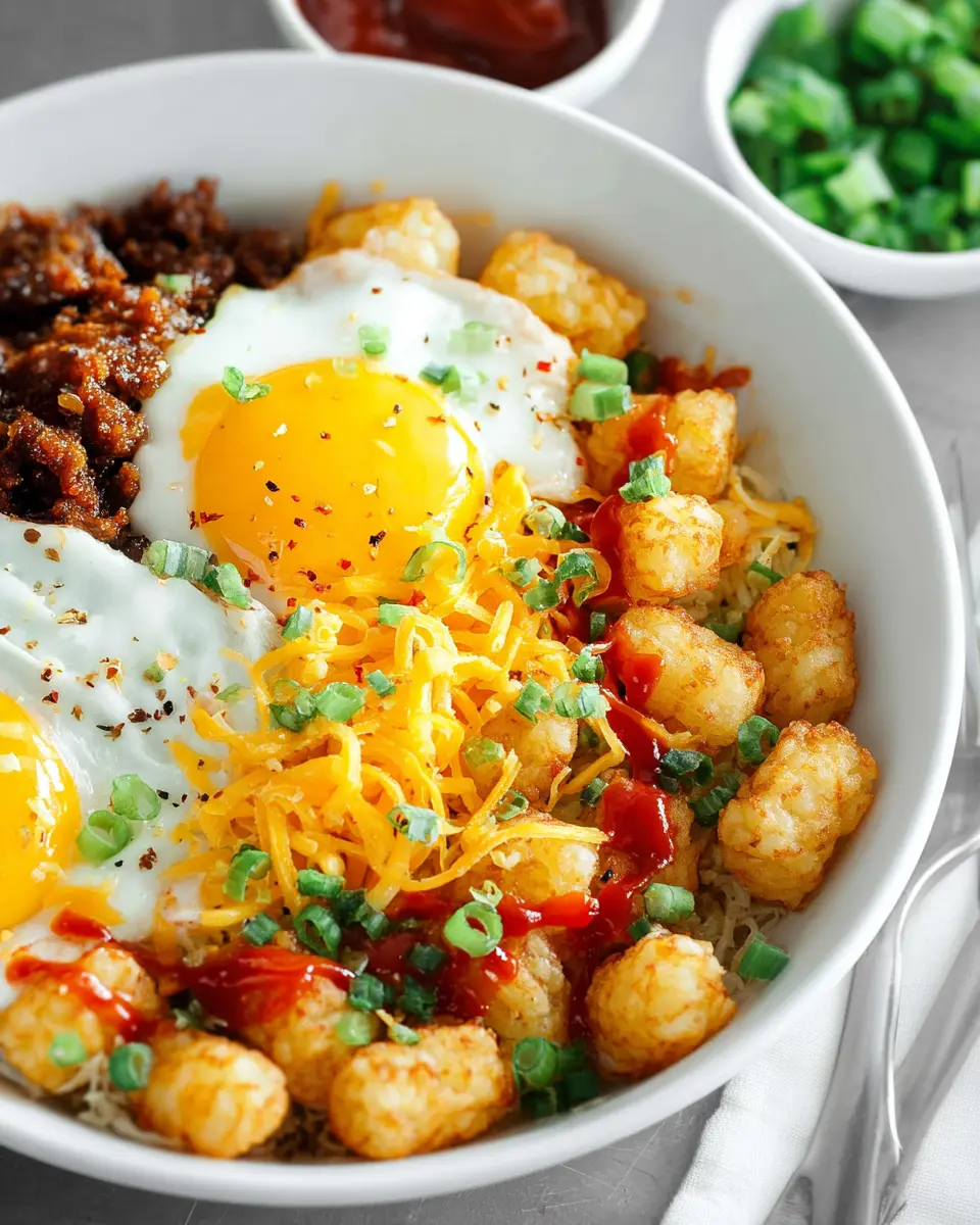 And there you have it, your Tater Tot Breakfast Bowl is ready to rock your morning! Don’t be afraid to get creative with toppings or mix-ins. Enjoy every bite, and feel free to share your creations with friends!